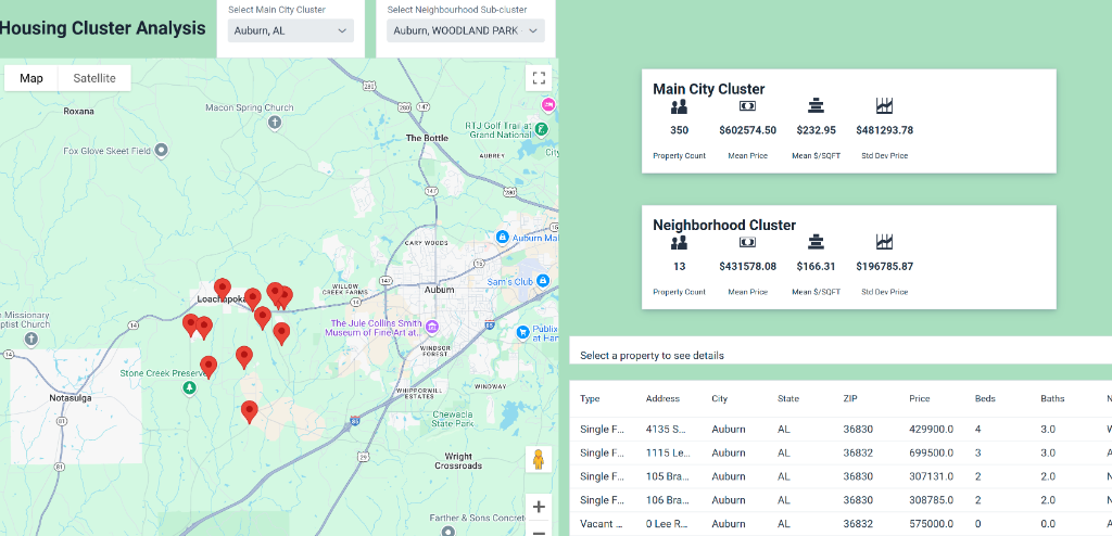 - 2. Select Main City Cluster: Pick a city from the first dropdown. The stats card updates (count, mean price, mean $/sqft, σ) and markers appear on the map. The data grid lists every property in that cluster.